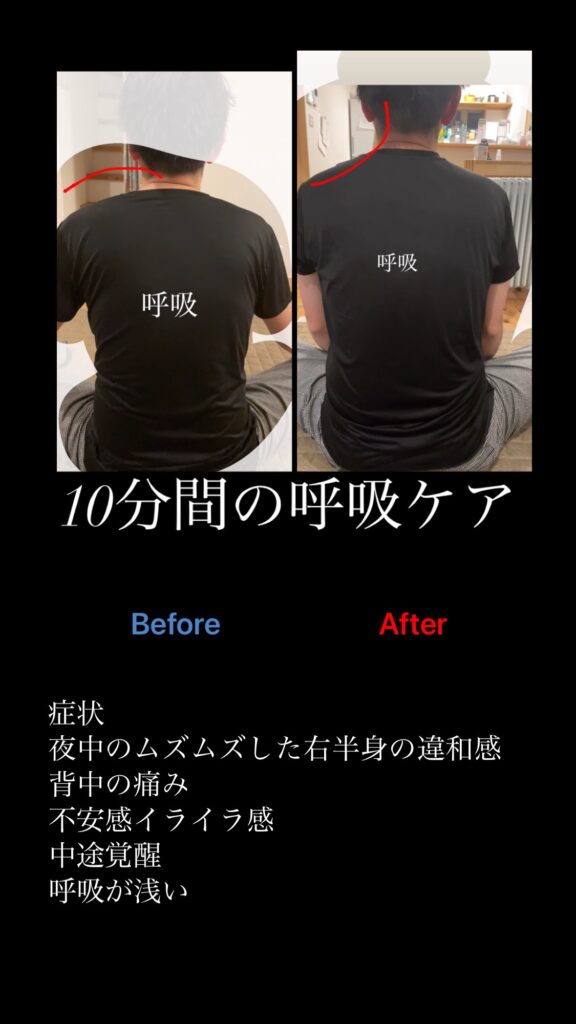 即時効果として呼吸が深くなり、胸郭の広がりと、姿勢は猫背の改善、頸部の前方突出の緩和、背骨周りの痛みの緩和があった。